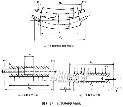 图3—37中上轧辊(即压浆辊)为中固辊,重量设为Gs;下轧辊(即上浆辊)为普通辊,重量设为Gxi;qF为一对轧辊的线压力。