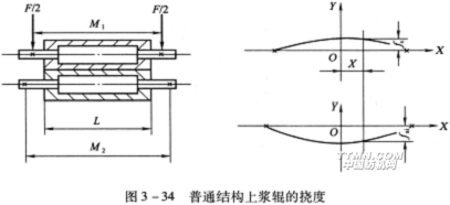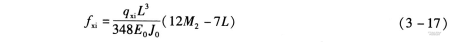 如图3—34所示,上浆辊可看做两端支撑的简支梁,假定受均布载荷qxi,不计剪力对挠度影响,则最大挠度fxi根据材料力学应为:
