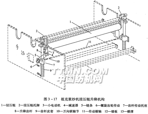 图3—17为祖克浆纱机浸压辊的升降机构。