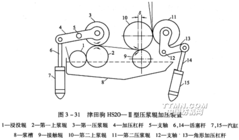 图3—31为津田驹HS20一Ⅱ型浆纱机的浆槽加压装置。纱线由浸没辊带入浆槽液面下,经第一对上浆辊、压浆辊轧压上浆,其垂直加压与一般浆纱机相似。加压杠杆支轴5装在机架上,汽缸进气时推动活塞杆6带动加压杠杆使第一压浆辊3产生压浆力。
