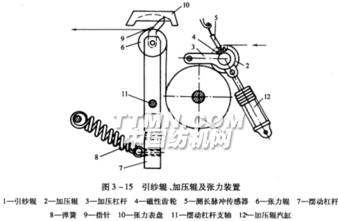 图3一15中引纱辊具有硬橡胶包覆的表面,对纱片握持力强。其直径与机前拖引辊一致(S系列均为212mm)。2为加压辊装于有支点的加压杠杆3的头端,通过重力紧压在引纱辊表面,并可由加压辊汽缸12的活塞推力脱离引纱辊。纱片绕过加压辊及引纱辊后,具有很大的压力和包围角,因而能拖动后方纱片,并且引入和送出的纱片具有不同的张力,为分段调控张力创造条件。