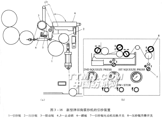 图3一16(a)为引纱装置结构示意,图3—16(b)为浆槽侧面的开关示意。引纱辊1用AC矢量电动机传动,引纱辊电动机切换开关7转向OFF即可脱开传动。压纱辊2通过自重加压,可由压纱辊升降开关8提升。摆动辊3用于吸收加减速时纱片张力的波动,其下部有弹簧提供适当的张力。两止动销4限制摆动辊的摆动范围。踏板6用于处理浆槽操作。起机带头及处理缠纱时,限位开关控制慢车运行。