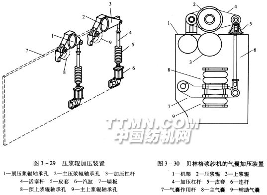 压浆装置的加压机构,多数为竖式垂直加压,如图3—29所示。在浆槽左右墙板7上留有预、主上浆辊轴承孔8和9,供安装上浆辊用。在其上方装有加压杠杆3和活塞杆4,杠杆中部留有预、主压浆辊轴承孔1和2,供安装压浆辊用。杠杆后方支点固定在墙板上。杠杆前方用圆销与活塞杆4相连,活塞杆上套着回复弹簧,外用皮套5保护。活塞汽缸下端固定在墙板上。当压缩空气从汽缸上端通人后,即通过加压杠杆的移动和弹簧缓冲实现压浆辊加压。当压缩空气从汽缸下端通入释压后,活塞杆上的回复弹簧可平衡压浆辊和杠杆的重力作用。
