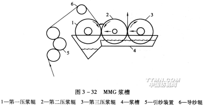 如浆槽结构图所示,纱片通过浸压辊后即进入压浆辊和上浆辊的轧压区。