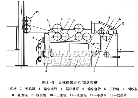 (1)使经轴退绕出来的纱片经过合并和张力调整积极地喂人浆槽,而不致消极地在浆槽润湿状态被上浆辊拖入,造成伸长过大。