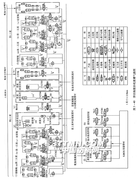 图3—40(i)为浆料浓度控制气路:在浆液浓度配备的新型控制装置中,信号输入电磁阀YV2710,使气流通入,操作汽缸阀,补充浓度较高的浆液,通过反馈信号保持浆液浓度稳定。