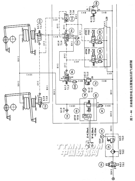 如图3—39(m)所示,主汽管00l经支汽管1215供气,经调压阀70调定压力(由压力表83指示)经手动阀71处,当浆槽控制板上的选择开关向上拨时阀R~A导通,气流经汽管1250、1251和1252和单向阀80进入汽缸81活塞下部,将压浆辊抬起。当选择开关下拨时阀P—B导通,气流经汽管1217、1214和1215进入汽缸81活塞上部,使压浆辊下压与上浆辊接触,并达到设定的压力。