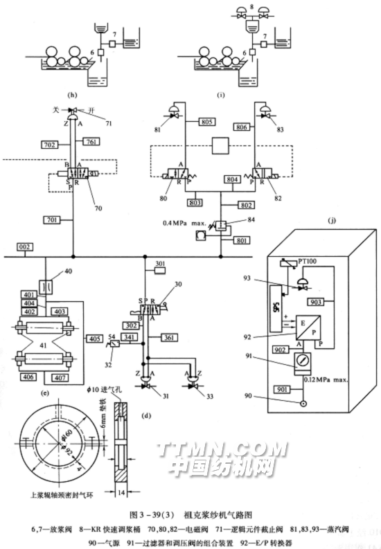 如图3—39(i)中,6和7为放浆阀,8为KR快速调浆桶,可以放在浆纱机附近现场调浆。KR桶的煮浆蒸汽阀由支汽管80l、802供给气流控制。当电磁阀80和82线圈通电受激,阀芯移到R—A位置时,气流即由803、805作用到蒸汽阀81和由804、806作用到蒸汽阀83,使其开汽煮浆。而阀6和7则按照前述气控系统放浆或关闭。