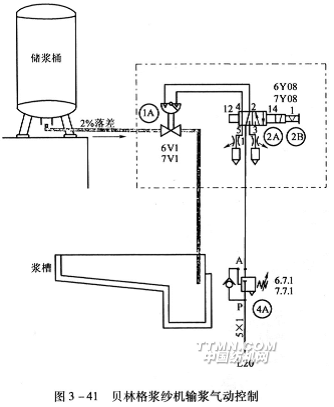 贝林格浆纱机输浆气动控制如图3—41所示。已经调制好的浆液存放在储浆桶中,桶位于高台上,且输浆管向下倾斜有2%的落差,可以自流放浆。气路L20输人压缩空气经减压阀4A通向电磁阀2A再进入逻辑元件的截止阀1A。由浆槽预热器中的液位控制器操纵电磁阀2A,决定是否输入浆液,以保持浆槽液面高度稳定。