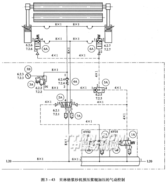 气源经换向阀1A,过滤、调压、测压装置2A、3A形成L20气路。气路经比例阀4A、止回阀5A进入上部气囊加压。气路经调压阀7A,电磁阀8A(在通过6A的气流配合下)电磁阀9A(在通过6A的气流配合下)止回阀13A进入下部气囊,将压浆辊抬起。同样,气路经调压阀10A,电磁阀9A(在电磁阀6A配合下)止回阀13进入下部气囊,也可将压浆辊托住。气路经电磁阀6A作用到电磁阀9A的一端或通过单向阀11A使13A换向,下部气囊空气可排出。