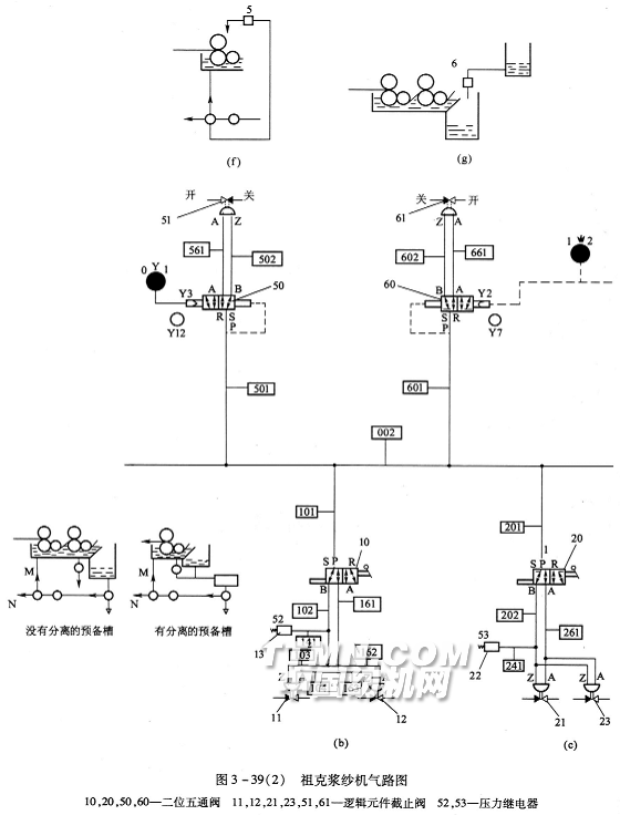 如图3—39(f)所示,主汽管002的压缩空气经501作用于二位五通阀50。当选择开关位于l时,电磁阀50处于R—B位置,气流经501进入逻辑元件截止阀51,使浆管中的阀5开启,喷洒装置向浆槽浸压辊、上浆辊喷浆。当选择开关换到0位时,阀50移到R—A位置,气流经561进入截止阀51,使浆管中的阀5关闭,停止喷洒。