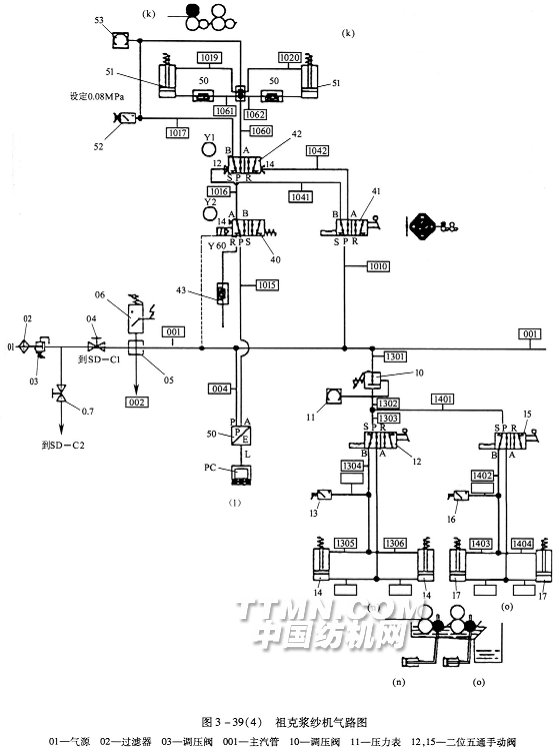 图3—40(c)为浸浆辊的气路,进气首先经过调压阀设定压力,再经过机械阀决定是否输入,经过手动五通阀决定是要浸浆辊脱开或是对上浆辊加压。