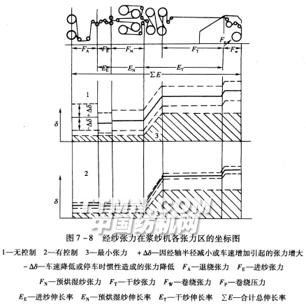 从加压辊与引纱辊的夹持点经弹簧张力调节辊、导纱辊、浸没辊(浸压辊)到压浆辊与上浆辊的挤压钳口,张力表示为FE。一般由上浆辊与引纱辊的线速比调节,但同时受纱线绕过上述各辊的阻力以及纱线张力、纱线排列均匀需要的张力水平所限制,并非都能达到负伸长,但应力求达到尽可能小的伸长率。