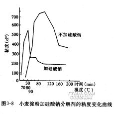 图3-8所示为小麦淀粉加入碱性分解剂硅酸钠及不加硅酸钠的粘度变化曲线。曲线反映了淀粉分解剂使淀粉大分子水解,降低大分子的聚合度和粘度,使浆液达到适于经纱上浆的良好流动性和均匀性;降低淀粉的糊化温度,缩短淀粉浆液达到完全糊化状态所需的时间,从而缩短浆液调制时间。