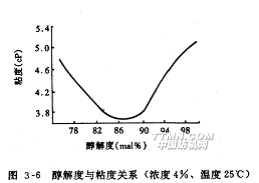 动物胶浆液的粘度与pH值关系如图3-4所示。由图可知:为稳定浆纱质量,生产中控制pH值为6~8,这时浆液的粘度大,稳定性也好。