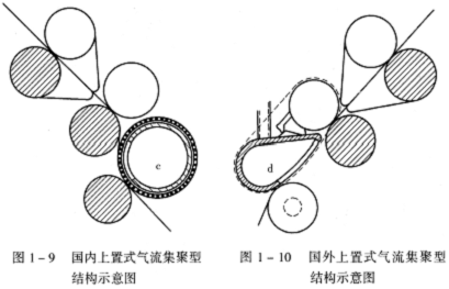 再有,气流集聚型紧密纺系统如果按照气流集聚元件的安装位置特征,又可以进一步分为两种类型:一种是吸风集聚元件c、d安装在集聚区纤维须条的上方,称为上置式气流集聚型紧密纺系统(图1—9、图1—10);另一种是吸风集聚元件a、b安装在集聚区纤维须条的下方,称为下置式气流集聚型紧密纺系统(图1—7、图1—8)。前者以德国青泽公司的Zinser700AirComTex机型为代表,且同样为唯一的实际应用代表;后者则为各厂商普遍采用的方式,但以德国绪森公司的EliTe®型紧密纺系统为典型。这种分类方法主要用于但不仅限于吸风管套集聚圈集聚型紧密纺系统。