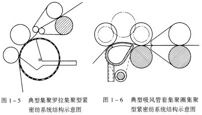气流集聚型紧密纺系统的主要结构特点是要有气流集聚元件,或更准确地说是负压吸风集聚元件和与之相连通的负压吸风系统。按照气流集聚元件的结构性质,气流集聚型紧密纺系统还可以进一步分为两种类型:——种是刚性吸风结构的气流集聚型紧密纺系统,其气流集聚元件是集聚罗拉,因而这种类型的气流集聚型紧密纺系统可称为集聚罗拉集聚型紧密纺系统。另一种是柔性吸风结构的气流集聚型紧密纺系统,其气流集聚元件是吸风管与外套的柔性材料集聚圈,因此这种类型的气流集聚型紧密纺系统也可称之为吸风管套集聚圈集聚型紧密纺系统。