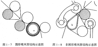 在气流集聚型紧密纺系统中,按照气流集聚元件的结构特征可以进一步分为集聚罗拉集聚型紧密纺系统和吸风管套集聚圈集聚型紧密纺系统两种(图1—5、图1—6)。按照气流集聚元件的吸风管的横截面形状特征,可以分为圆形吸风管紧密纺系统和非圆形吸风管紧密纺系统两种(图1—7、图1—8)。非圆形横截面的吸风管也常称为异形吸风管。一般认为异形吸风管优于圆形吸风管,因为异形吸风管可以使其工作面尽可能延伸到前罗拉钳口处,以减小无控制区,但这只是在狭义上说;从广义上看,集聚罗拉兼有吸风管的作用,也是吸风管,但它本身还兼做前罗拉,因而吸风管与前钳口之间根本就不存在无控制区,因而广义的圆形吸风管紧密纺系统不一定劣于非圆形吸风管紧密纺系统。只有限定在吸风管套集聚圈集聚型紧密纺系统中,才可以认为异形吸风管紧密纺系统优于圆形吸风管紧密纺系统。