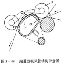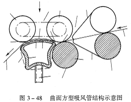 混用型输出钳口要求吸风管及集聚圈的设计配合,不仅要满足吸风集聚机构的技术要求,而且要满足输出钳口的技术要求,或者说在满足吸风集聚机构技术要求的基础上,同时要满足输出钳口的技术要求。因此,该类型输出钳口的吸风管除个别采用圆形截面(如上海二纺机EJM971型紧密纺系统,参见图2—28)以外,一般均采用异形截面吸风管,如典型的EliTe®紧密纺系统的梨型吸风管。正是因为如此,为满足输出钳口的设计要求,给吸风管的形状结构设计提供了广阔空间。除了本章3.3节所述的梨形和三角形截面的吸风管之外,还有其他形状的异形吸风管,例如,立达公司的一件国际专利申请(专利申请号01803257.5)所设计的笔者称之为曲面方型吸风管(图3—48)。这种吸风管形状设计除可使集聚作用能尽可能地靠近牵伸钳口,改进纤维须条从牵伸装置到集聚区的过渡以及集聚区到输出钳口的过渡之外,还可同时具有张紧集聚圈的作用,以减少张