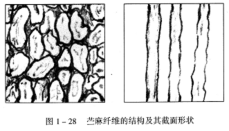 我国是产麻大国,因而麻类资源十分丰富,有黄麻、亚麻、苎麻及罗布麻等。目前常用于转杯纺的麻纤维,主要是苎麻,纤维直径在18—25μm,其结构与截面形状如图1—28所示。由于苎麻纤维比较粗硬、刚性大、表面光滑,因而,在加捻时会给捻回的形成和传递造成不利影响;又因为苎麻纤维的脆性大、易折断,纺纱时断头率较高。转杯纺所使用的苎麻原料多是精落麻,其长短差异大