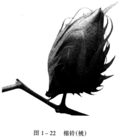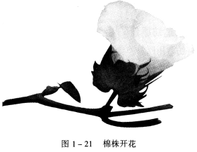 棉农培植的棉株生长后开花,如图1—21所示,然后结成棉铃(桃),如图1—22所示,棉铃成熟后自然绽放出棉絮,如图1—23所示,棉絮由棉纤维集结组合而成。实际上,棉纤维是由包裹在棉籽表皮的细胞发育成熟伸长后而形成的。