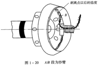 剥取阶段是凝棉槽内的须条经纱臂牵引而脱离凝棉槽,纱臂在阻捻头的作用下已获得捻度(回),但这时是假捻作用。当然,在剥离点之后也有部分捻度渗透到须条上。图1—20中/AB段为纱臂,从剥离点到阻捻头这段纱条上产生的是假捻,其作用是增加须条的动态强力,防止在这段纱条上产生断头。转杯纺产生的断头有90%以上发生在剥离点至阻捻头这段须条上(即纱臂上)。