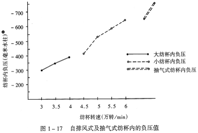 在自排风式转杯纺纱机中,由于高速旋转的纺杯把杯中原有的空气从底部的排气孔排出以后,纺杯内便产生负压(真空度),因纺杯的直径有大小之分,转速有快慢差别,并且又受纺纱器密封性能好坏的影响,因此,纺杯内负压高低存在着较大的差别。图1—17所示为自排风式及抽气式纺杯内的负压值。