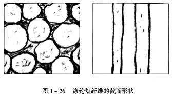 涤纶是诸多化学纤维中的一种,它由喷丝头喷成涤纶长丝,然后再根据需要切成不同长度的涤纶短纤维,其截面形状如图1—26所示。适合转杯纺加工的涤纶短纤维的线密度在1.47~2dtex,长度为38mm。由于涤纶的纤维长短一致且不含杂质和灰尘,并且在出厂前都施有油脂,起软化润滑作用,因此,涤纶是化学纤维中可纺性较好的一种纤维。就纺纱而言,涤纶也存在一些缺点和不足之处,如涤纶在纺纱过程中与高速旋转机件发生摩擦时会产生静电,静电荷之间的吸附与排斥作用将影响纤维间的正常输送、转移及并合作用。并且涤纶的刚性较大,表面又含有油脂,给捻回(度)的形成和传递造成一定困难。还因化学纤维的透气性能差,在作为服装面料用纱时,涤纶一般多与棉纤维进行混纺,即涤棉纱。