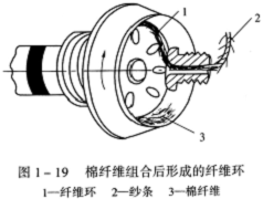 原先附着在分梳辊齿端的棉纤维,在负压气流的吸引下,便脱离分梳辊齿尖的控制,通过输棉通道和隔离盘进入纺杯。棉纤维在纺杯高速旋转时所产生的离心力及负压气流的共同作用下,沿着纺杯的滑移面进入凝棉槽,由于棉纤维的凝聚与并合作用而形成纤维环,跟随纺杯一起旋转。
