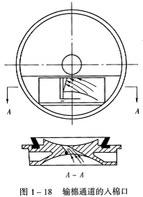 (2)为了使棉纤维更好地转移和有序地流动,输棉通道内气流必须有加速流动的趋势,气流加速的梯度越大,对棉纤维的转移、伸直和舒展越有利,所以,输棉通道入棉口大而出棉口小,如图1—18所示。抽气式转杯纺输棉通道的入棉口和出棉口悬殊更大。