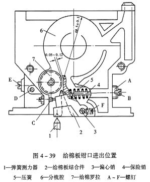 (2)以上几个部位的调整顺序为:调整给棉板钳口进出位置一调整给棉板压力一调整给棉板与给棉罗拉隔距。