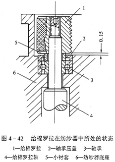 有时,检修以后旋紧给棉罗拉时,会发现给棉罗拉转不动,其原因是未装给棉罗拉下面的小衬套(图4—42中的5),使给棉罗拉下端面与纺纱器底座相接触,小轴承失去作用。在这种情况下,只要把小衬套装好,问题即可得到解决。