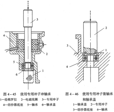 当给棉罗拉轴的上轴承损坏以后需要调换新轴承时,应把纺纱器倒置过来,使用专用冲子把上轴承冲掉,如图4—45所示。待装新轴承时,应从纺纱器上方使用专用冲子先把轴承冲到位,然后再把轴承盖冲到位,如图4—46所示。