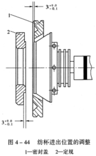mm。若距离太大,会影响纺杯内的负压;若杯口凸出密封盖,有可能与输棉通道发生摩擦,影响纺杯的转速而产生弱捻纱及造成纱条断头。正确的调整方法如图4—44所示。