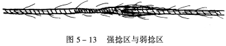 (1)转杯纺纱属自由端纺纱,由于棉纤维呈自由状态分布在纺杯的凝棉槽中,在接头的瞬间,纱头被负压气流吸人纺杯后在离心力的作用下被甩人凝棉槽与纤维环进行搭接,由于纤维叠加和捻回的作用,原纱头上包裹一层棉纤维。在接头过程中,原纱条既没有解捻过程,又不存在棉纤维重新组合的过程,所以接头处要比原纱条粗一些,应为原纱条直径的2~2.5倍。另一方面,由于接头处纱条较粗,其离心力以及与纺杯凝棉槽之间的摩擦阻力均较大,所以,接头处的捻度传递困难,往往是中间较少而形成弱捻区,接头的前端因捻度的积聚而形成强捻区,如图5—13所示。无论是弱捻区还是强捻区都要降低纱条的强力,一般情况下,接头处的强力只是原纱条强力的50%—70%。