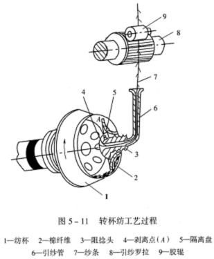 由分梳腔经输棉通道转移后进人纺杯的棉纤维均匀地分布在纺杯的凝棉槽中,纺杯高速旋转并在引纱作用下对须条产生剥离作用,见图