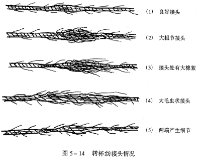图5—14(1)为转杯纺良好接头情况,图5—14(2)、(3)、(4)为转杯纺几种典型的接头不良情况。