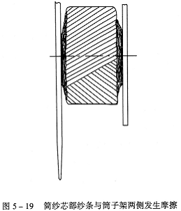 在卷绕过程中,筒纱的卷绕速度应与引纱速度保持一定的比例关系。在纱条加捻的过程中,引纱速度是恒定的,不允许有快慢变化。为了使筒纱有良好的成形,卷绕速度也应是恒定不变的。但筒纱的旋转速度随筒纱直径的增大而逐渐减慢,当筒纱还处在直径较小,尤其是在纸管上刚开始卷绕时,其转速最快。因为胶木槽筒的表面比较硬且光滑,对小筒纱的摩擦力较小,因此卷绕时容易出现滑溜现象。因为筒纱直径较小时,纱层比较薄、比较僵硬而缺乏弹性,所以与胶木槽筒的接触弧线短,而且筒纱直径较小时重量轻,因此减小了对胶木槽筒的压力。在以上几种因素的共同作用下,小筒纱时,其内圈纱条的卷绕张力较小,纱层之间比较疏松。但随着纺纱时间的延续,筒纱直径逐渐增大,其重量及弹性也都在增加,因此,筒纱与胶木槽筒的接触弧线在加长。在筒纱直径增大的同时,转速在逐渐减慢(惯性在减小),这时筒纱与胶木槽筒之间的摩擦力增加,而滑溜系数减小,所以,纱条的卷绕张力也逐渐增大。因此,在卷绕过程中会把筒纱内圈原先疏松的芯部向外挤压,并且筒纱直径越大,对芯部纱条挤压得越厉害,肥胖的程度也越严重。当筒纱的直径达到150~180mm时,筒纱的芯部纱条即会超出纸管而与筒子架的两侧发生摩擦,如图5—19所示。这时若处理得不及时,就会产生磨烂的坏筒纱。