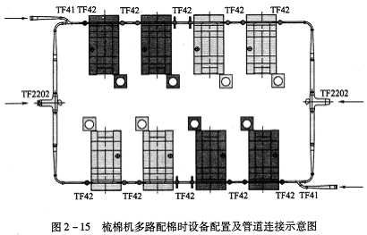 (3)当梳棉机配台数多于8台时,建议采用TF2202型配棉三通将其分成两路;当梳棉机配台数为10台时,必须用T172202型配棉三通将其分成两路;梳棉机最多配台数不得多于12台。