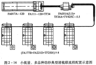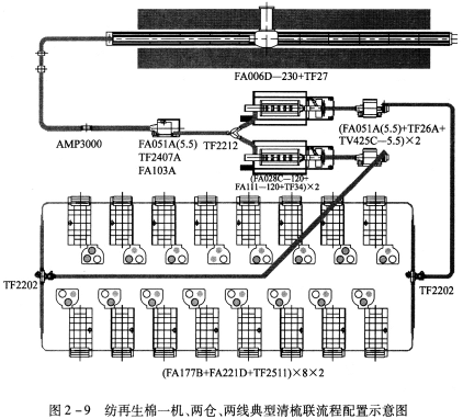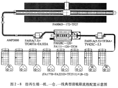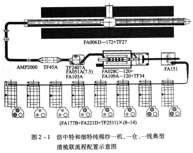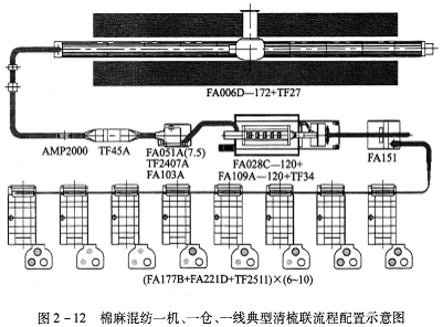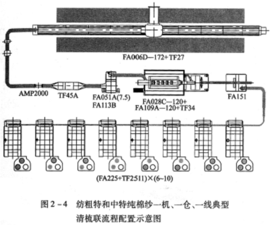 FA017A-120型预混棉机+FA111—120型单辊筒清棉机(TF34型磁铁装置)→FA051A(5.5)型凝棉器+TF26A型高架装置+TV425C-5.5型输棉风机→(FAl77B型喂棉箱+FA22lD型梳棉机+TF2501型圈条器)×4。