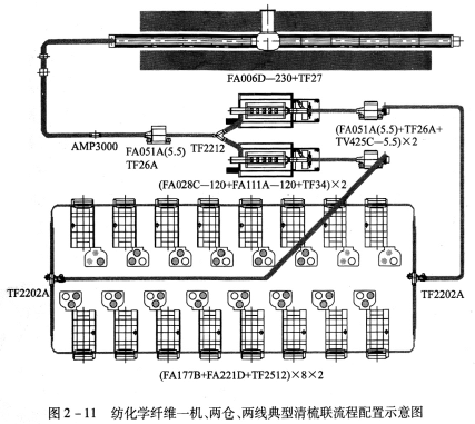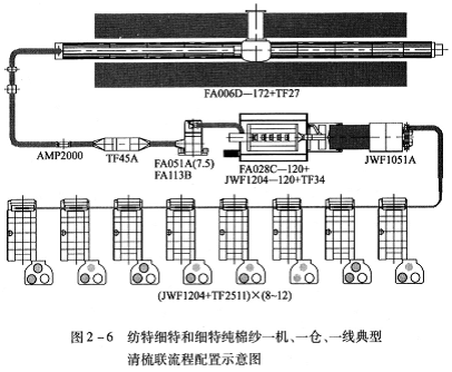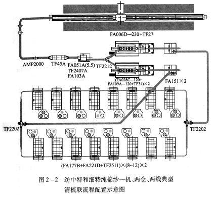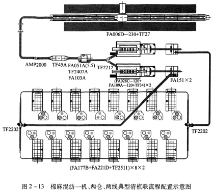 FA006D-230型往复抓棉机(附TF27型桥式磁铁)→AMP2000型金属火星探除器→TF45A型重物分离器→FA051A(5.5)型凝棉器+FAll3B型单轴流开棉机→TF2212型两路配棉器→[FA028C-120型多仓混棉机+FAl09A-120型三辊筒清棉机(附TF34型磁铁装置)]×2→FAl51型除微尘机×2→TF2202型配棉三通×2→(FA225型梳棉机+TF2511型圈条器)×8×2。