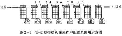 两路梳棉机的配棉管道上可加装TF42型摇摆阀(图2—15),可实现多种配棉要求,满足不同的产量需要,以实现梳棉机纺多个品种时能够按不同台数进行配棉,满足不同品种产量的要求。其配棉原理类似单路梳棉机配棉的原理。