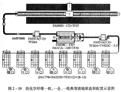化学纤维中不含杂质,在清梳工序中主要是开松和梳理。在流程中一般不配置轴流开棉机,推荐配置一台FA111A型或JWF1124A系列单辊筒清棉机即可,典型流程有如下两种。
