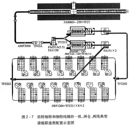 FA006D~230型往复抓棉机(附TF27型桥式磁铁)→AMP2000型金属火星探除器→TF45A型重物分离器→FA051A(5.5)型凝棉器+FAll3B型单轴流开棉机→TF2212型两路配棉器→[FA028C-120型多仓混棉机+JWFll24—120型单辊筒清棉机(附TF34型磁铁装置)]×2→FAl51型除微尘机×2→TF2202型配棉三通×2→(JWFl204型梳棉机+TF251l型圈条器)×8×2。