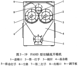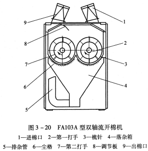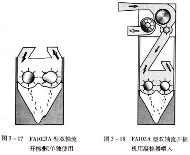 (3)FA103A型双轴流开棉机具有单独使用(图3—17)或与FA051A型凝棉器联接使用两种模式可供选择(图3—18),采用凝棉器喂入时,能将该机前后输送纤维的气流彻底分开,使两部分互不影响,整个系统稳定可靠,建议采用该种工艺配置。