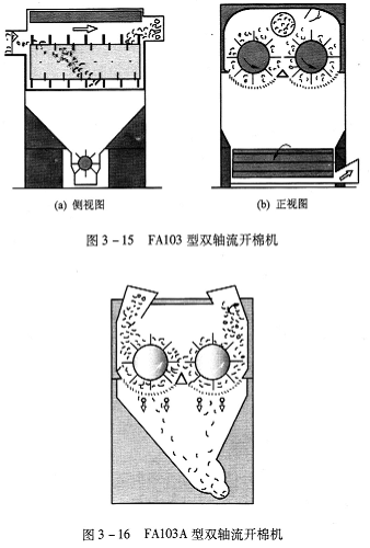 FA103系列双轴流开棉机适用于各种等级的原棉及混合纤维的开松、除杂,有FA103型和FA103A型两种。两种机型的主要区别在于纤维的喂入和输出方向不同,FA103型双轴流开棉机采用的是纤维在两打手的中间喂入,沿打手的轴向前进并输出(图3—15),开松能力弱,除杂效率低;FA103A型双轴流开棉机采用的是纤维沿第一打手的切向进入本机后沿两开棉打手的表面螺旋前进,由两开