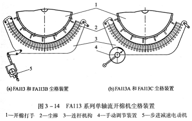 (3)尘格装置:尘格装置主要由尘棒和调节机构组成(图3—14),尘棒为三角尘棒,分左右两组,每组36根,尘棒安装初始角度10°,最大角度40°,尘棒之间隔距5~11mm,尘棒与开棉辊筒隔距12~19mm。FA113型、FA113B型通过两只步进减速电动机带动连杆机构对两组尘棒进行同步调节;FA113A型、FA113C型通过两个手动调节装置带动连杆机构对两组尘棒进行同步调节。尘棒安装角度可根据原料情况和工艺要求在控制面板上或机外手动调节装置分6挡设定,每挡之间安装角度相差5°。尘棒安装角度与隔距之间的关系见表3—4。