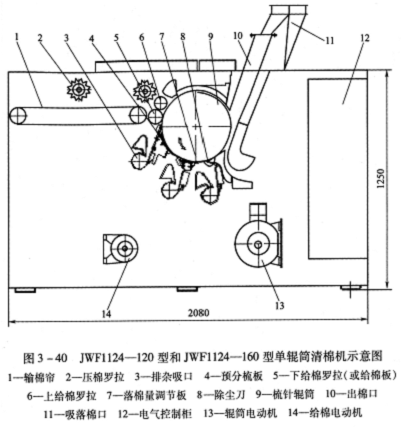 (2)该机采用直径400mm的梳针辊筒,JWF1124—120型和JWF1124—160型的辊筒周围设有三块预分梳板、三把除尘刀、三个连续吸口和两块落棉调节板,变消极式的除杂为积极式除杂,除杂、开松能力强,一般在纺纯棉流程中作精开棉机用,尤其适用于纺长绒棉的流程中。