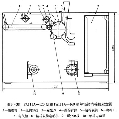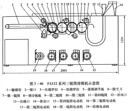 本机主要由机架、给棉系统、清棉系统、排杂系统和电气控制系统组成。主要结构见图3-46。