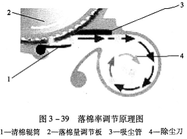 (4)排杂系统:FA111—120型和FA111—160型的排杂系统由吸尘管、调节板及排杂管等组成。在清棉辊筒的各除尘刀处均装有吸尘管,并与机器两侧的排杂管相连。清棉系统分离的尘杂落在吸尘管内,被连续抽吸的气流送至滤尘机组。在清棉辊筒的第二除尘刀处装有调节板(图3—39),调节板可进行无级调节,以改变落棉量和口落棉含杂量。
